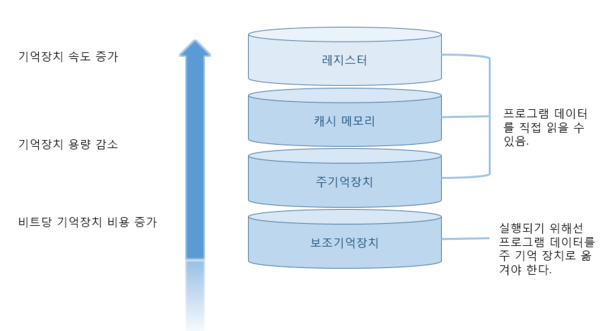 속도 차이를 위해 계층과 계층 사이의 계층을 캐싱 계층이라고 하고, 캐시 메모리와 보조 기억장치 사이에 있는 주기억장치(RAM)을 보조기억장치의 캐싱 계층이라 할 수 있다.