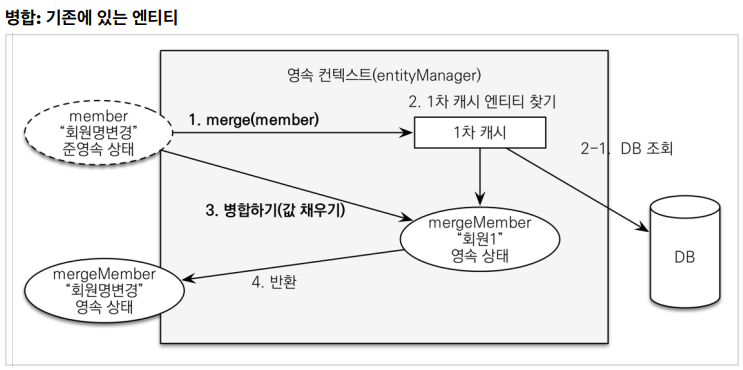 병합은 준영속 엔티티를 영속으로 만들어주지만 영속 엔티티의 값을 모두 준영속 엔티티의 값으로 교체한 이후 변경감지 기능을 통해 DB에 UPDATE SQL 실행된다.