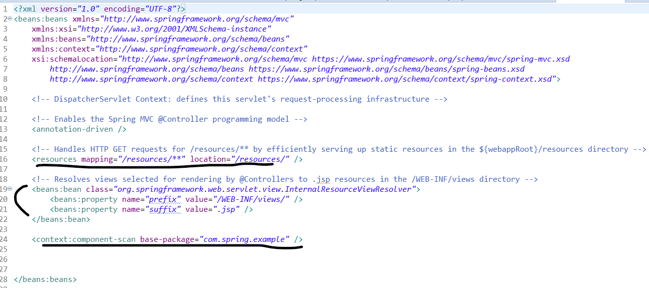 servlet-context에 controller, viewResolver, resource 매핑같이 web과 관련된 빈을 등록하고, 컴포넌트 스캔을 xml로 진행한다. interceptor나 multipartResolver와 같이 웹에서 필요한 빈들도 수동으로 등록해야한다.