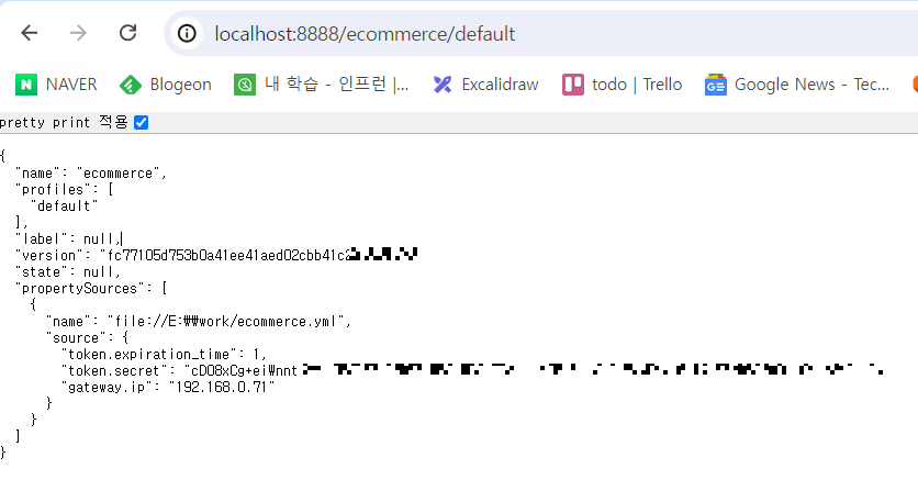 위의 방법 둘 중 하나를 골라 설정을 적용하면, 해당 서비스의 application.yml에는 없지만 ecommerce.yml에 있는 정보도 Environment를 통해 접근이 가능합니다.