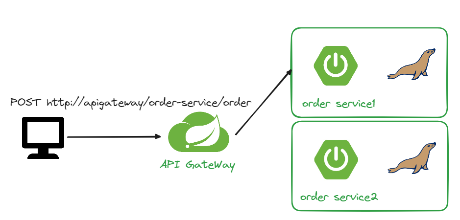 APIGateway는 등록된 두개의 orderservice 중에 하나에 API를 넘겨주는데 order service 1에 주문 등록이 되었다고 가정하겠습니다.
