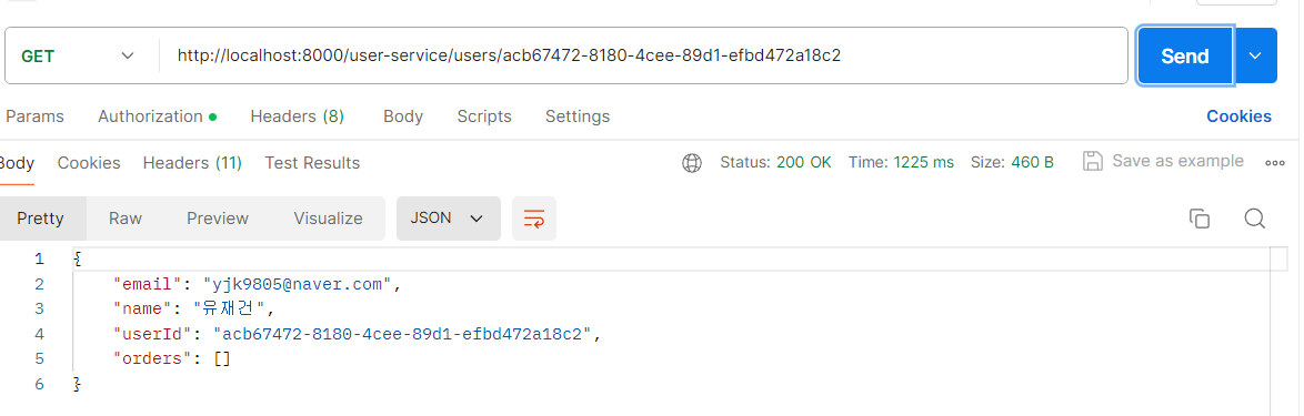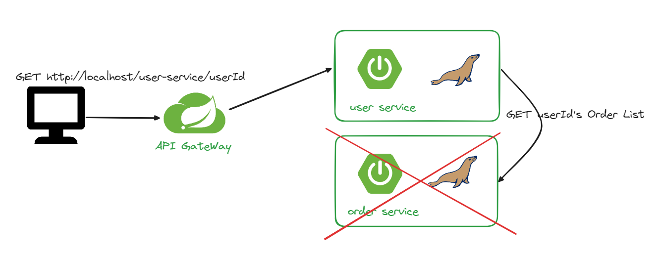 이때 만약 order service가 다운되었거나 기동이 안되어 있으면 user-service까지 에러가 전파되어 500 서버 에러가 반환될 수 있습니다.