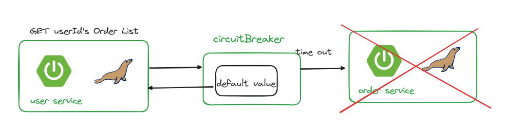 Order Serivce가 down되어 있어도 fallback method를 통해 빈 List를 반환해 User Service 까지 에러가 전파되지 않습니다.