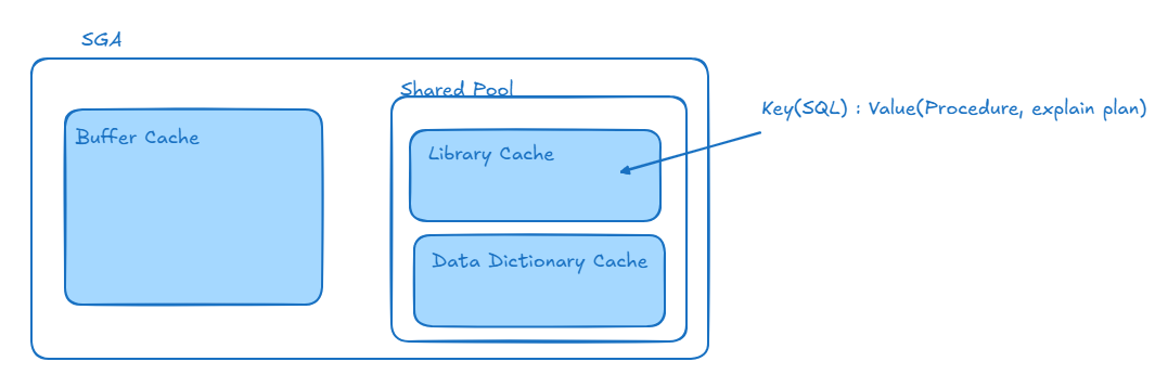 캐시에 저장하고 활용할 때 SQL 자체가 Key, 프로시저, 예상 실행계획 등은 Value로 활용합니다. 동일한 결과집합을 반환하는 SQL이라도 대소문자, 공백이 조금이라도 다르면 하드 파싱이 진행됩니다.