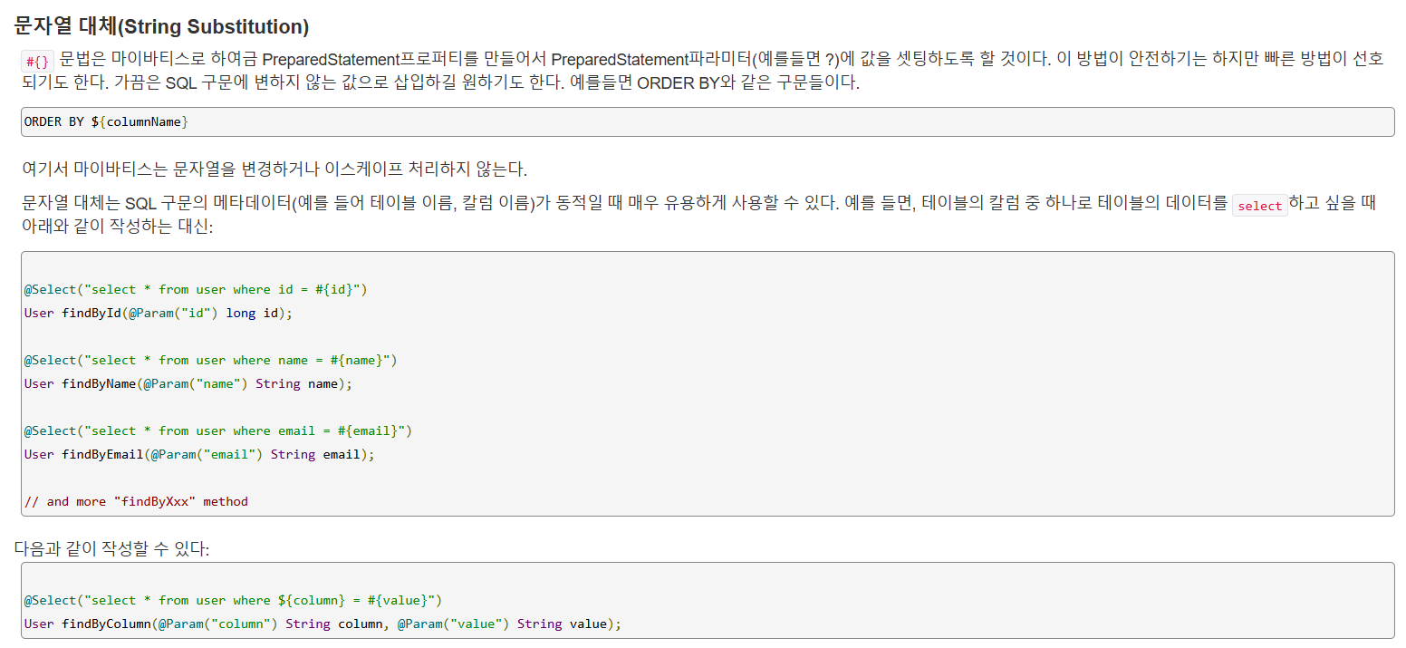 지금까지 SQL은 결과집합이 잘 나오는 것에만 집중했는데 어떤 과정을 통해 결과를 얻게 되는지 아는 것도 중요하다는걸 느꼈습니다. Mybatis에 파라미터 맵핑할 때 #{}, ${}가 있고 왜 #{}를 주로 쓰는건지 알고 쓰면 좋을 것 같습니다.